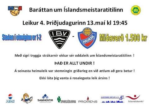 Leikur fjögur í viðureign ÍBV og Hauka um íslandsmeistaratitilinn verður í kvöld í Íþróttamiðstöðinni Vestmannaeyjum. Staðan er 1-2 í einvígínu og því mikilvægt að allir sem einn mæti á völlinn.