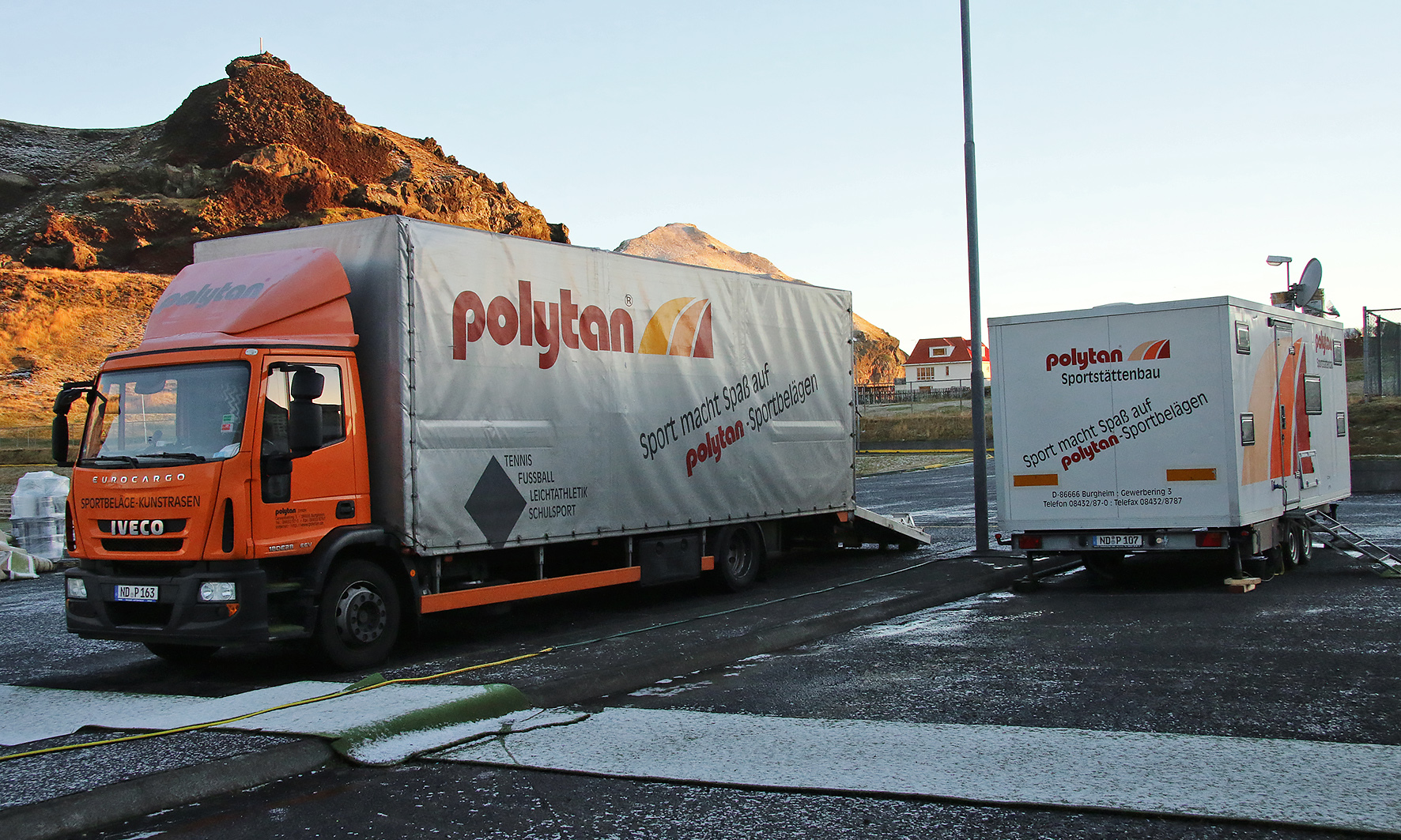 Nú í morgun mánudag, varð vart við hreyfingu í Eimskipshöllinni og er óskandi að lagning á nýju gervigrasi komist nú á fullt skrið og Eimskipshöllin verði klár fyrir æfingar innan tíðar.