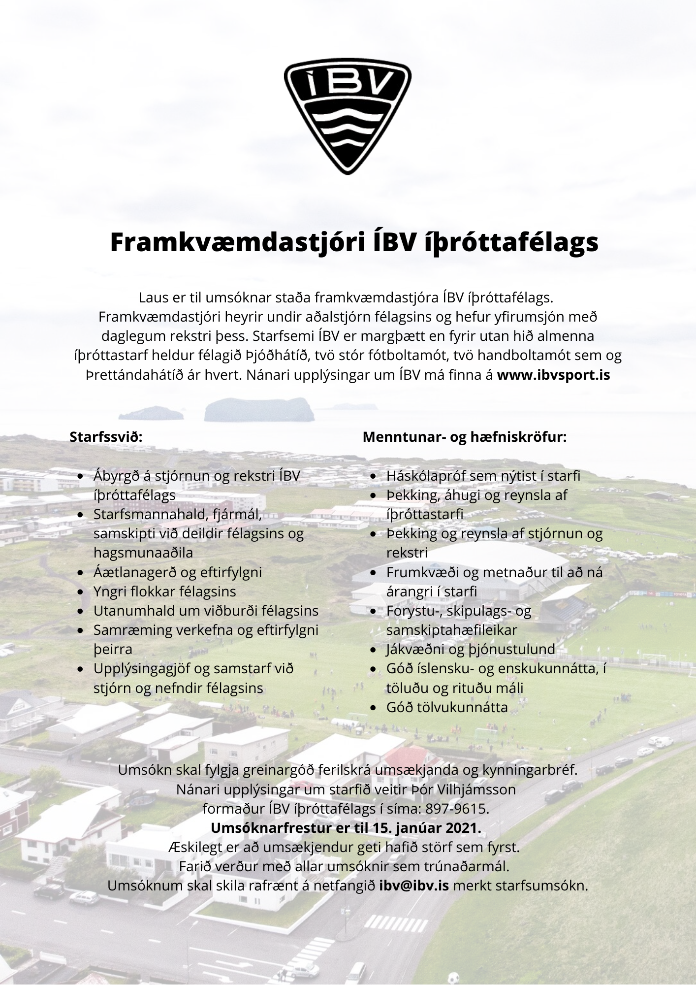 Laus er til umsóknar staða framkvæmdastjóra ÍBV íþróttafélags. Framkvæmdastjóri heyrir undir aðalstjórn félagsins og hefur yfirumsjón með daglegum rekstri þess.