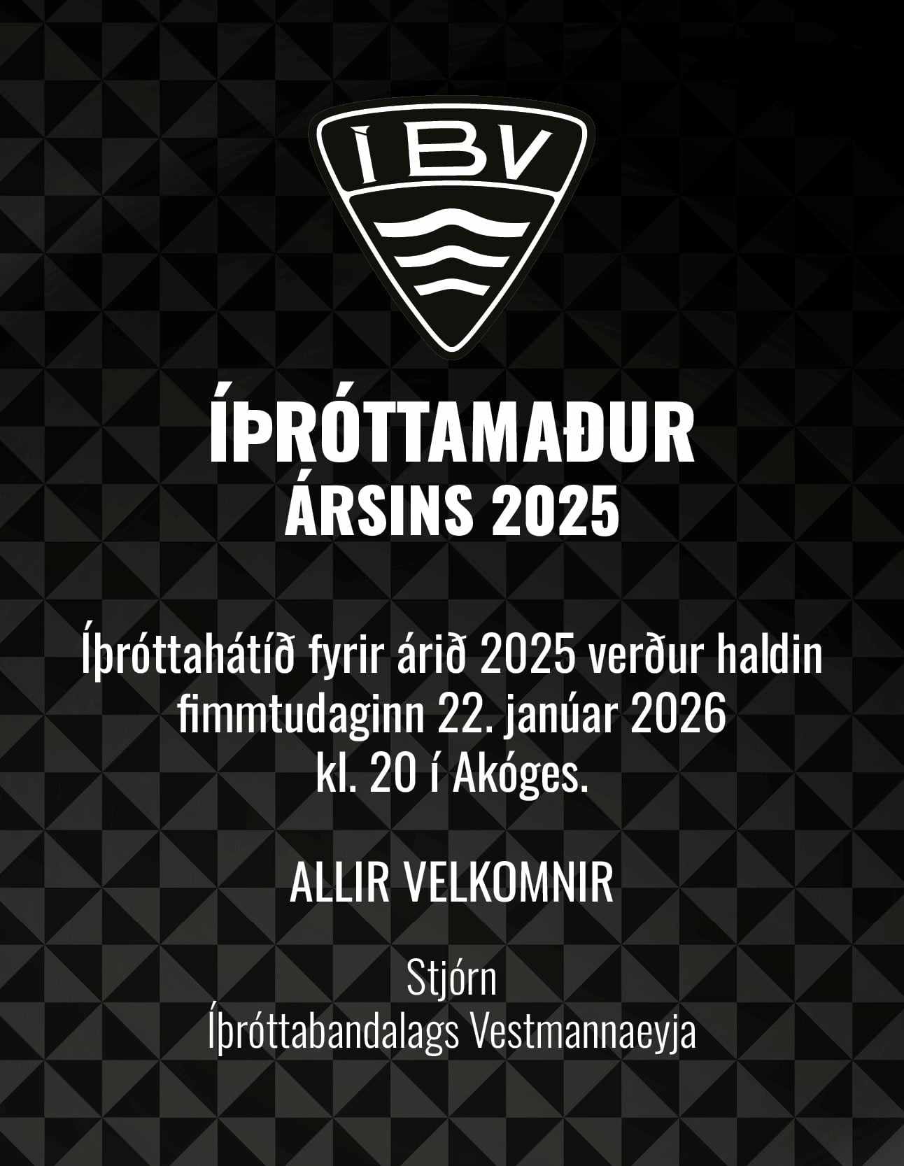 Íþróttahátíð, Íþróttabandalags Vestmannaeyja, verður haldin fimmtudaginn 22. janúar kl 20:00 í Akóges.